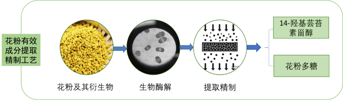 花粉多糖是以花粉為原料,分離得到水溶性花粉提取物。在提取過程中,引入了纖維素酶解破壁技術(shù),并配合一定程度的機械攪拌,在較為溫和的條件下破除油菜花粉壁,能夠最大程度的釋放花粉中花粉多糖等有效成分,實現(xiàn)花粉資源的高效利用。